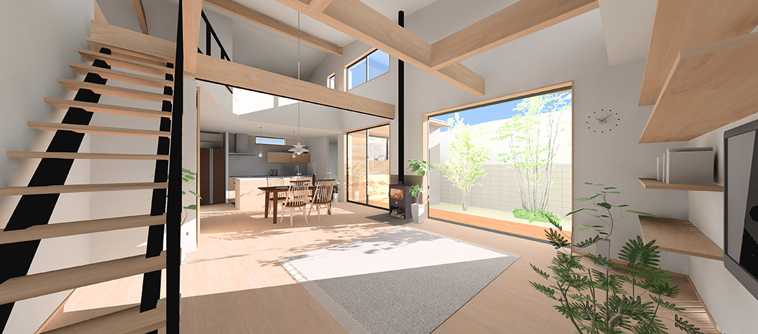 吹き抜けにより、明るく開放感のある27畳のLDKは、ぜひご覧いただきたい空間。